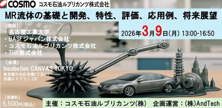 2026年3月9日(月)開催 コスモ石油ルブリカンツ社主催「MR流体の基礎と開発、特性、評価、応用例、将来展望」セミナーでは、磁気粘性流体(MR流体)について、基礎原理から材料設計、特性評価、実装事例、将来展望までを体系的に解説します。