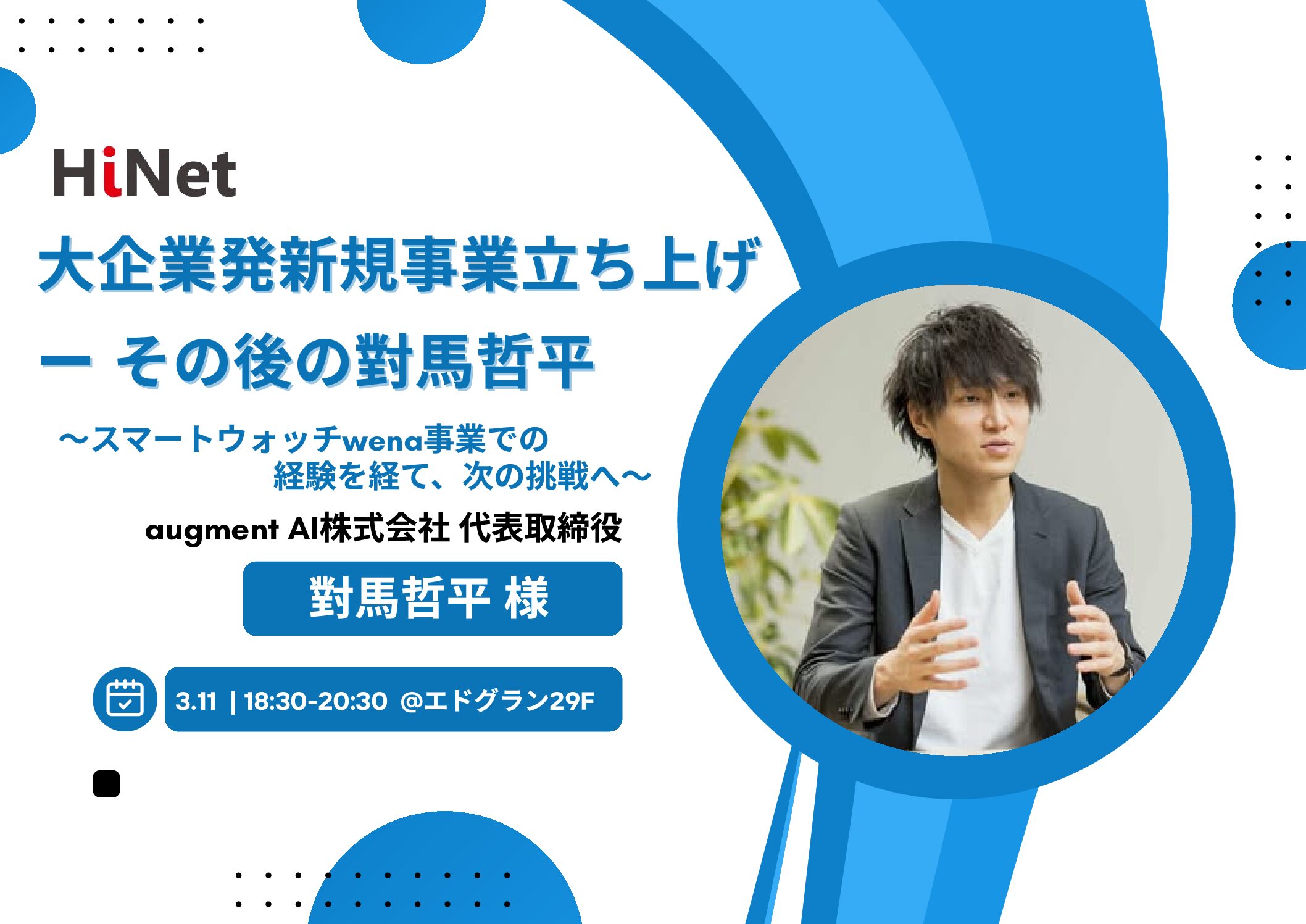 3⽉は、ソニーのSSAPプログラムを通じて、⼊社2年⽬で新規事業に挑戦されたイントレプレナー・對⾺哲平さんをお迎えします。對⾺さんはこれまで、スマートウォッチ「wena」事業の⽴ち上げを通じて、⼤組織の中で新規ビジネスを構想し、承認を得て、事業として形にしていくプロセスに真正⾯から向き合ってこられました。今回は「その後の對⾺哲平」と題し、wena事業を通じて得た経験がどのように次の意思決定や挑戦につながっていったのか、また現在取り組んでいる事業や今後の展望・ビジョンについて語っていただきます。皆様の中には、⼤⼿企業の中で新規事業⽴ち上げに取り組まれている⽅も多く、また異分野で挑戦されている⽅にとっても、多くの⽰唆を得られる内容となるはずです。⼀⽅的に話を聴くだけでなく、参加者の疑問や新しい発想を交えながらディスカッションを⾏い、理解を深め、⾏動につなげていく創発型のセミナーとして企画しております。皆様、奮ってご参加ください。