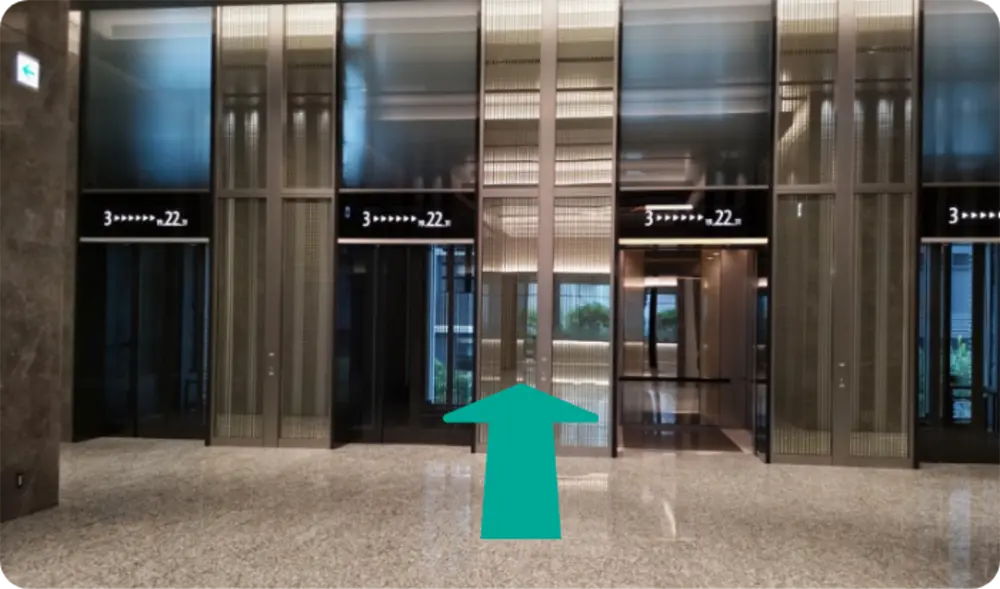 エスカレーター左手のエントランスから入っていただき、左手中央奥にあるエレベーターホールから22階までお越し下さい。