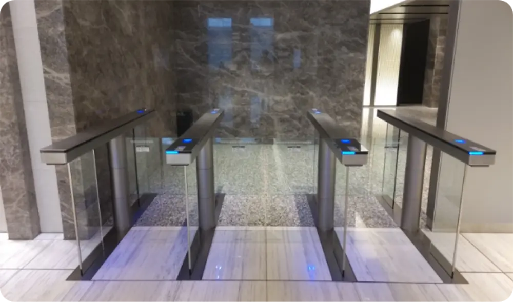 ゲート手前のQRコードリーダーに、QRコードをかざしご入館下さい。(入館証QRコードは、スマホ画面・出力のどちらでも読み取り可能です)