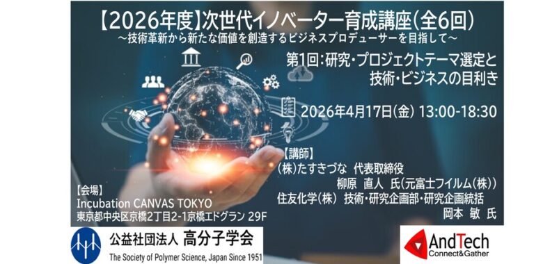 当日は事務局より、本年度に実施した「2025年度版次世代イノベーター育成講座」の報告も行う予定です。2026年4月開講予定の高分子学会主催「次世代イノベーター育成講座」にご関心のある方も含め、ぜひ、この機会にご参加をお待ち申し上げます。 奮ってのご参加をお待ち申し上げます。